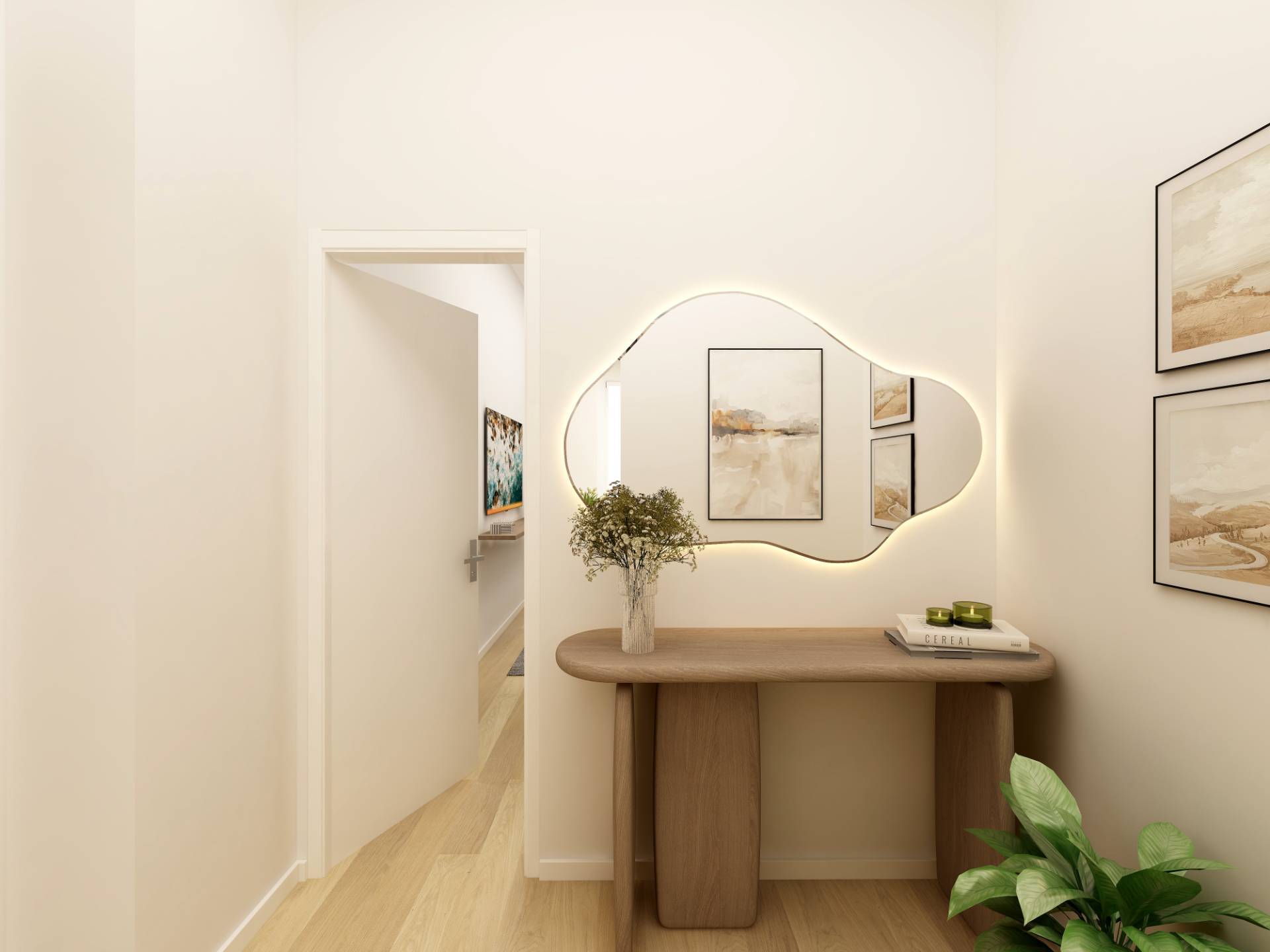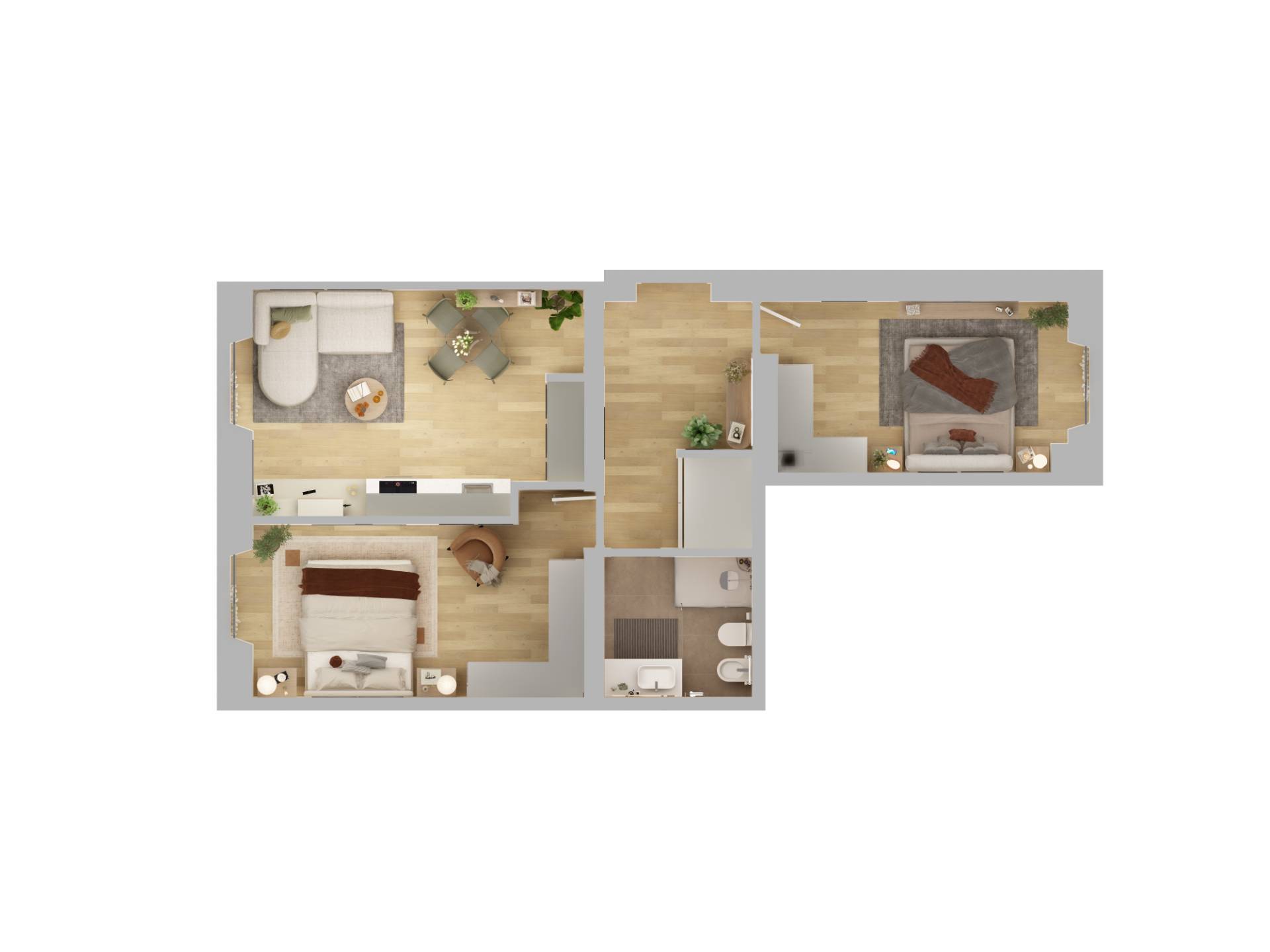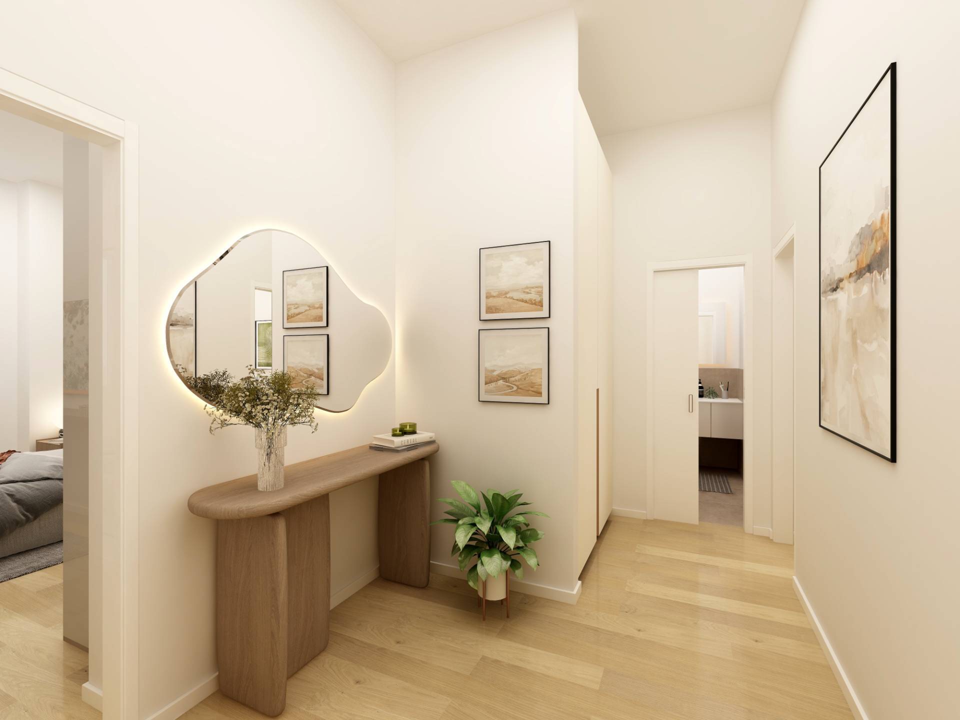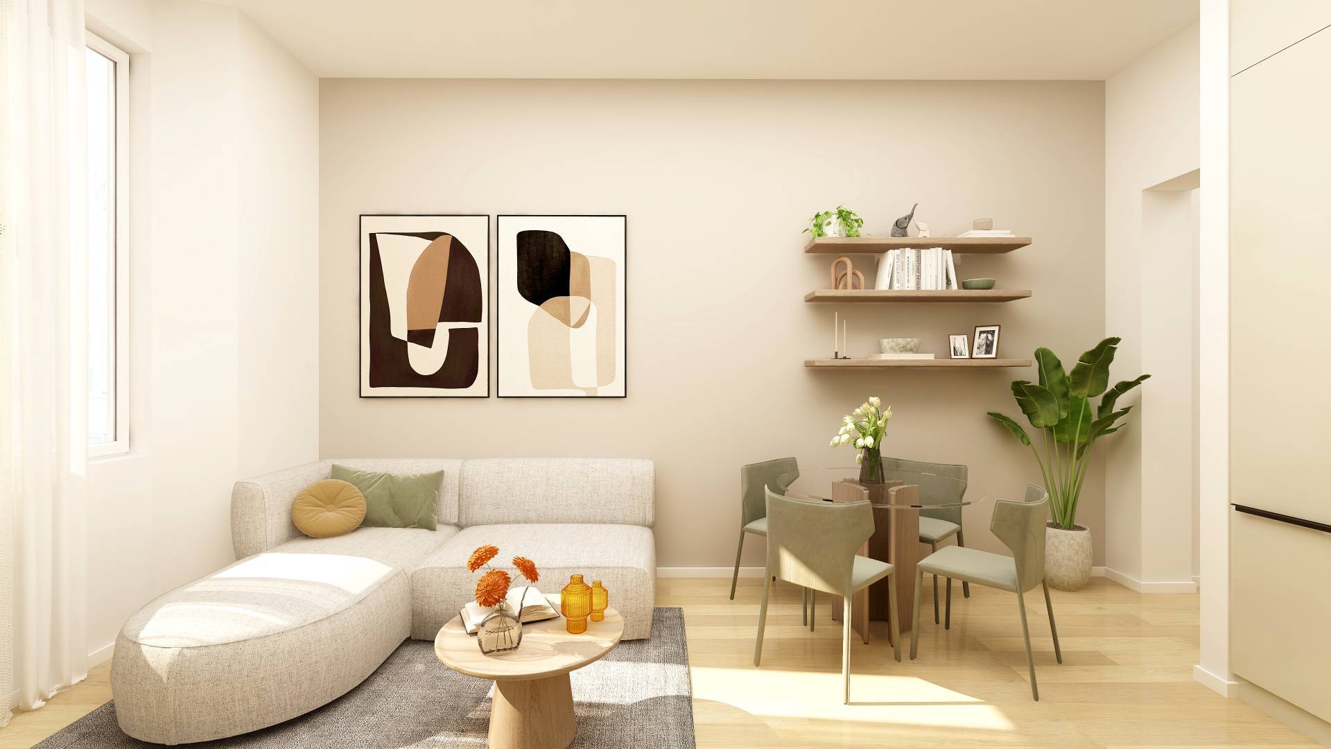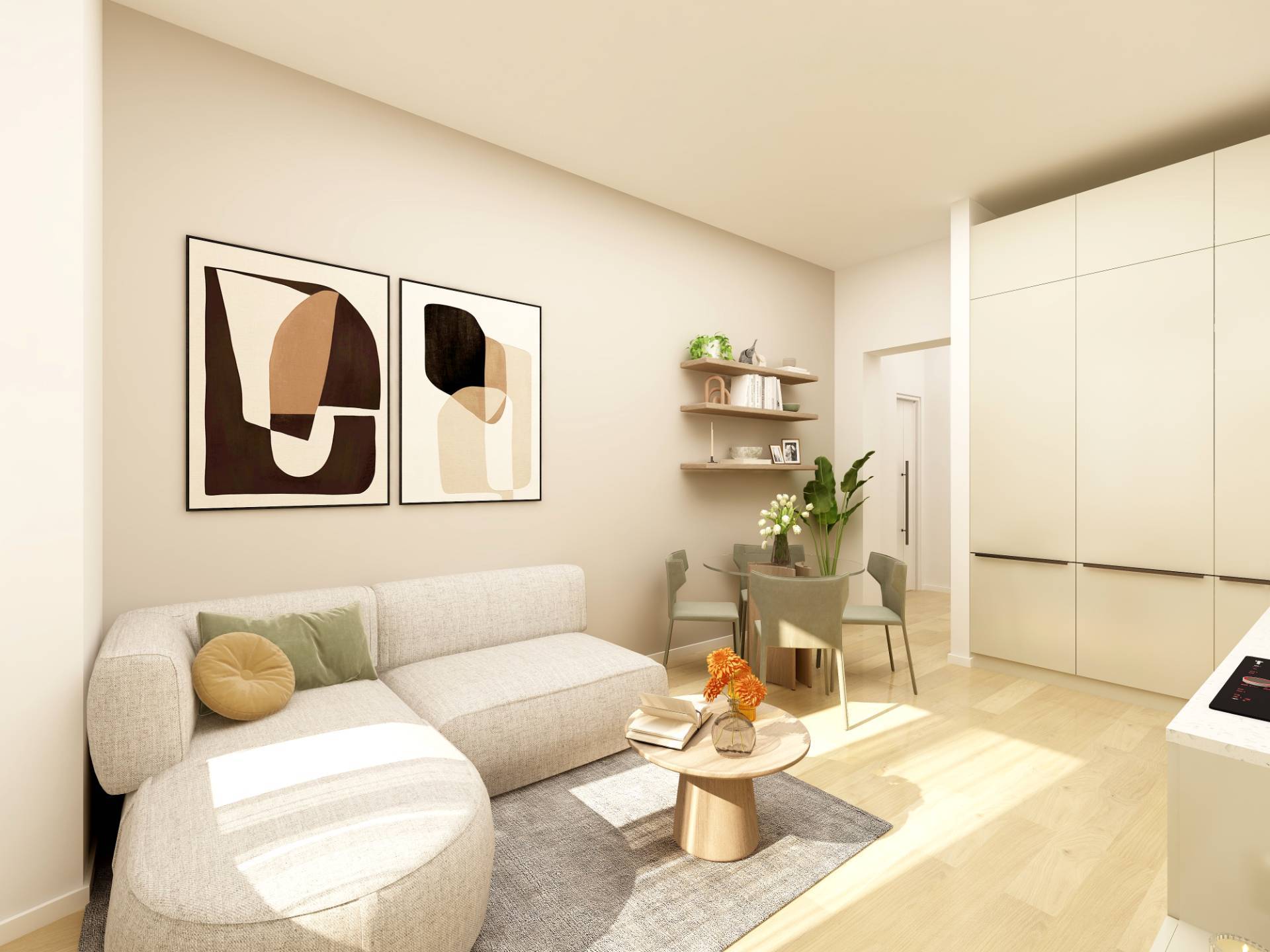 Ingresso, soggiorno con cucina a vista, 2 camere da letto, antibagno e bagno. Esposizione sud-ovest.